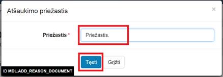 3. Nurodyti atšaukimo priežastį ir pasirinkti tęsti veiksmą.