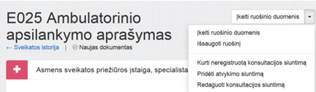 Darbo su atvykimo duomenimis meniu rodomas E025 ir E003 medicininių dokumentų kūrimo ir redagavimo puslapiuose. Leidžiami darbo su atvykimo duomenimis veiksmai: