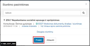 2. Pridėti atvykimo siuntimą – įvesti siuntimo informaciją, jeigu pacientas atvyko pagal siuntimą, kuris užregistruotas ESPBI IS.