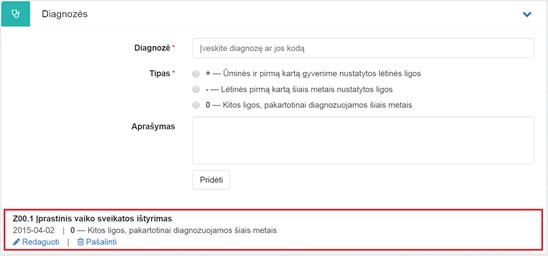 o Diagnozė – automatiškai parenkama diagnozė Z00.1 Įprastinis vaiko sveikatos ištyrimas.
