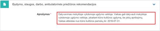 priežiūros rekomendacijos užpildomas informacija iš pažymos laukų: