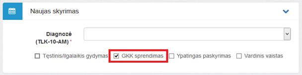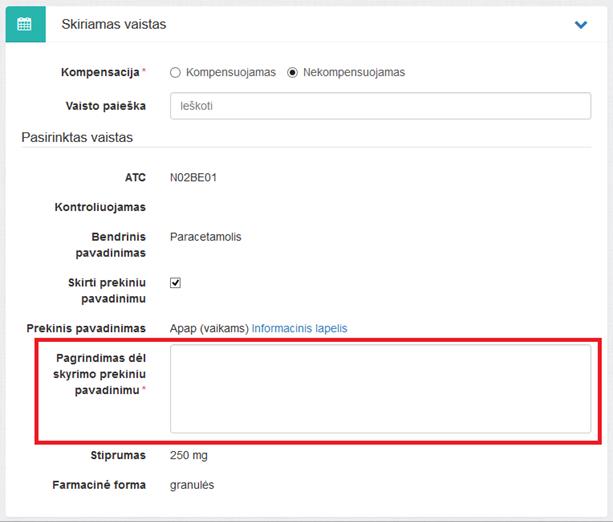 Skiriant vaistą GKK sprendimu, būtina užpildyti privalomą lauką Pagrindimas dėl skyrimo prekiniu pavadinimu.