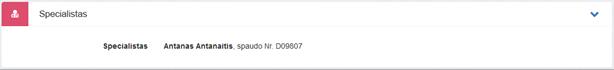 1. Specialistas. Bloke matoma informacija apie specialistą registruojantį etapo duomenis, kuris užpildomi automatiškai pagal prisijungusį naudotoją.
