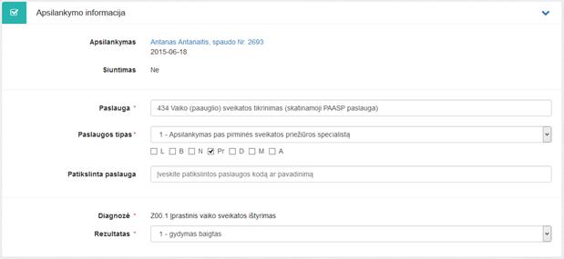 1. Apsilankymo informacija. Bloke matoma informacija apie specialistą, siuntimą bei diagnozę užpildomi automatiškai pagal pasirinktą ESI įrašą ir yra neredaguojami.
