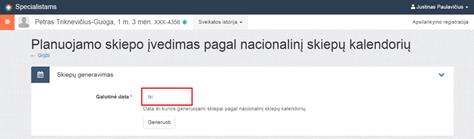 Planuojamą skiepą pagal nacionalinį skiepų kalendorių galima įvesti nurodžius galutinę datą, iki kurios norima generuoti skiepus ir išsaugojus sugeneruotas schemas (schemos ne pasirenkamos, o išsaugomos visos sugeneruotos).