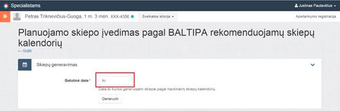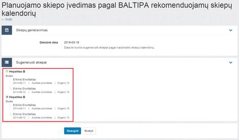 Planuojamą skiepą pagal BALTIPA skiepų kalendorių galima įvesti nurodžius galutinę datą, iki kurios norima generuoti skiepus, pasirinkus norimas schemas ir išsaugojus: