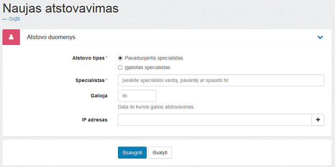 Užpildžius duomenis Naujas atstovavimas puslapyje, galima pasirinkti išsaugoti pakeitimus (Išsaugoti) arba išvalyti puslapyje atliktus pakeitimus (Išvalyti).