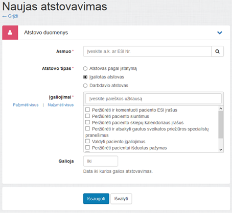Užpildžius duomenis Naujas atstovavimas puslapyje, galima pasirinkti išsaugoti pakeitimus (Išsaugoti) arba išvalyti puslapyje atliktus pakeitimus (Išvalyti).