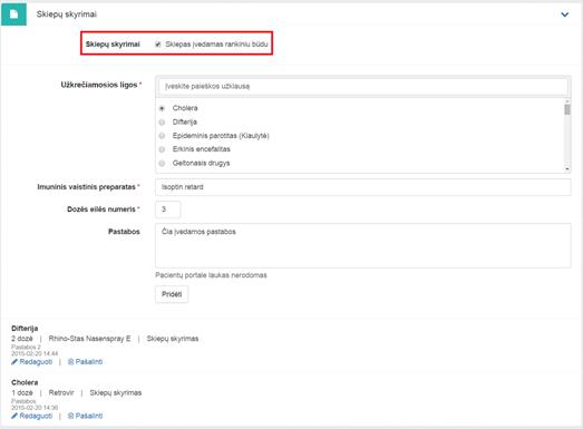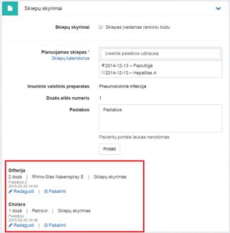 Mygtukais Redaguoti ir Pašalinti iškviečiamas atitinkamai skiepų skyrimo redagavimo arba pašalinimo funkcionalumas.