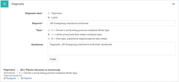 Diagnozė pridedama, kai užpildžius privalomus laukus paspaudžiama