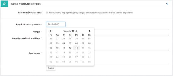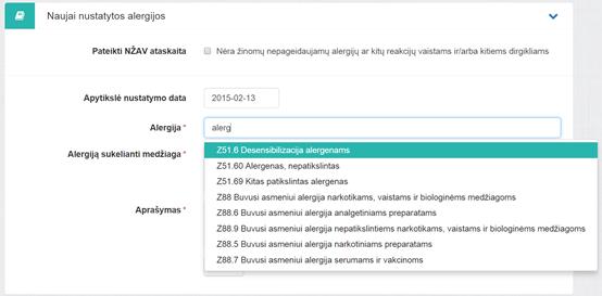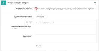 dirgikliams (NŽAV). Alergija pridedama, kai užpildžius privalomus laukus paspaudžiama