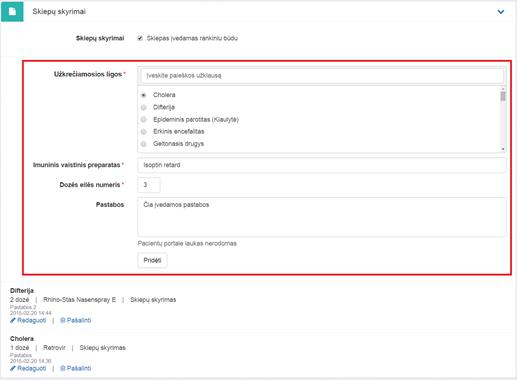skyrimų informacija pildoma bloke Skiepų skyrimai.