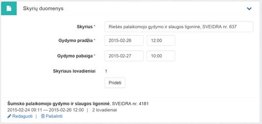 duomenys. Bloke įvedama skyrių, kuriuose pacientas buvo gydytas, informacija.