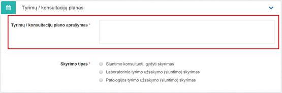 6. Tyrimų / konsultacijų planas. Bloke užpildoma tyrimų ar konsultacijų plano informacija ir galima pridėti šiuos skyrimus: Siuntimo konsultacijos, tyrimų, gydymo skyrimas, Laboratorinio tyrimo skyrimas, Patologijos tyrimo skyrimas.