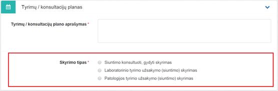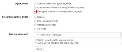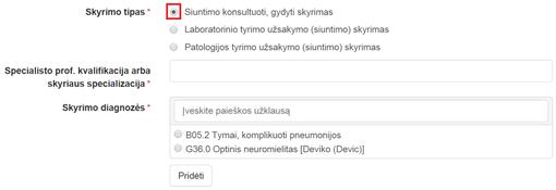 Jei norima pridėti skyrimą (skyrimą pridėti nėra būtina), lauke Skyrimo tipas būtina pasirinkti vieną reikšmę iš: Siuntimo konsultuoti, gydyti skyrimas, Laboratorinio tyrimo užsakymo (siuntimo) skyrimas arba Patologijos tyrimo užsakymo (siuntimo) skyrimas. Priklausomai nuo pasirinkto skyrimo tipo, toliau pildoma skyrimo informacija laukuose: