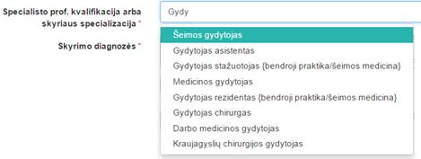 sistema siūlo pasirinkimus iš ACHI klasifikatoriaus.
