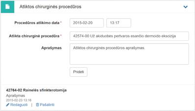 Atliktos chirurginės procedūros informacija pildoma laukuose: