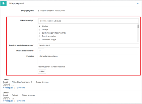 skyrimai – bloke galima pridėti skiepų skyrimą. Skyrimas pridedamas,