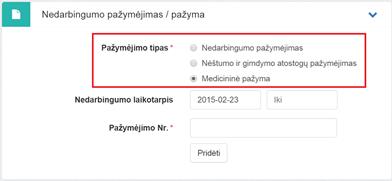 Prieš pridedant požymį, jog bus išduodama pažyma, reikia papildomai užpildyti laukus: