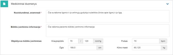 4. Medicininiai duomenys. Bloke užpildoma informacija apie paciento medicininius duomenis. Teisingo užpildymo pavyzdys: