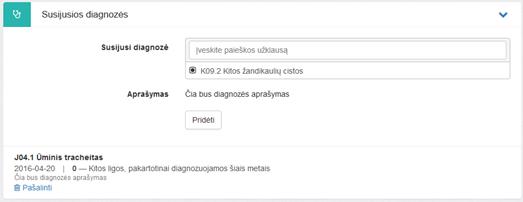 diagnozės. Diagnozė pridedama, kai pasirinkus diagnozę paspaudžiama