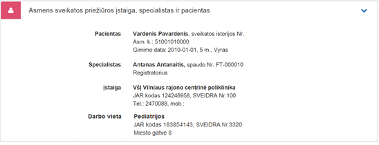 1. Asmens sveikatos priežiūros įstaiga, specialistas ir pacientas. Bloke matoma informacija apie atvykimą registravusią sveikatos priežiūros įstaigą, prisijungusį specialistą, jo darbo vietą bei pacientą. Šie duomenys užpildomi automatiškai pagal prisijungusį naudotoją ir pasirinktą specialistą ir yra neredaguojami.