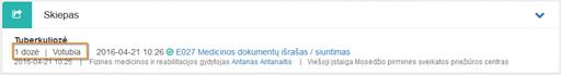 2. Skiepas. Bloke matoma skyrimo (jei kuriamas pagal skiepų skyrimą) ar siuntimo (jei kuriamas pagal E027 siuntimą) informacija bei nuoroda į atitinkamai skyrimo ar siuntimo dokumentą. Bloko pavyzdys, kai dokumentas kuriamas pagal E003 ar E025 dokumente įvestą skiepų skyrimą:
