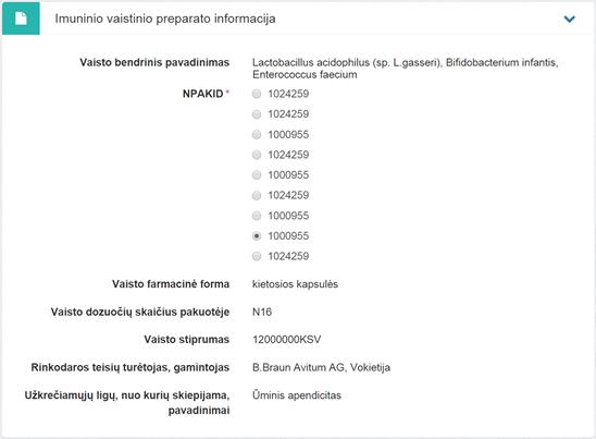 3. Imuninio vaistinio preparato informacija. Bloke pasirenkama vaisto, nurodyto skiepo skyrime, pakuotę (NPAKID). Kiti duomenys, priklausomai nuo skiepe nurodyto vaistinio preparato ir pasirinkto NPAKID, užpildomi automatiškai iš Vaistinių preparatų ir kompensuojamųjų MPP katalogo. Teisingo bloko užpildymo pavyzdys: