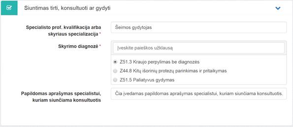 2. Siuntimas tirti, konsultuoti ar gydyti. Blokas matomas, jei dokumentas kuriamas pagal E003 dokumentą. Kadangi kuriant siuntimą pagal E003 dokumentą, dar nėra įvestų skyrimo duomenų (skirtingai nei kuriant E027 dokumentą pagal E025 esantį skyrimą). Užpildyto bloko pavyzdys: