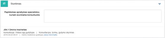 Lauke Papildomas aprašymas specialistui, kuriam siunčiama konsultuotis galima (nebūtina) nurodyti papildomą informaciją specialistui, kuriam siunčiama konsultuotis. Bloke taip pat matomi skyrimo, kurio pagrindu yra išrašomas E027 siuntimas, duomenys (neredaguojami):