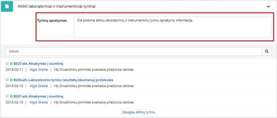 Tyrimų aprašymas lauke pildoma aprašymo informacija.