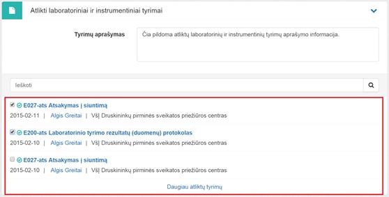 6. Atlikti laboratoriniai ir instrumentiniai tyrimai. Bloke pildomas atliktų laboratorinių ir instrumentinių tyrimų aprašymas ir pasirenkama informacija apie susiejamus atliktų laboratorinių ir instrumentinių tyrimų rezultatų medicininius dokumentus: