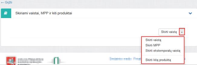 2. atsidariusiame skyrimų sąrašo lange išskleidžiamame meniu pasirinkus reikiama punktą Skirti vaistą arba Skirti MPP arba Skirti ekstemporalų vaistą arba Skirti kitą produktą.