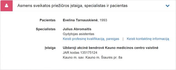 1. Asmens sveikatos priežiūros įstaiga, specialistas ir pacientas. Bloke matoma informacija apie atvykimą registravusią sveikatos priežiūros įstaigą, prisijungusį specialistą bei pacientą. Šie duomenys užpildomi automatiškai pagal prisijungusį naudotoją ir pasirinktą pacientą ir yra neredaguojami.