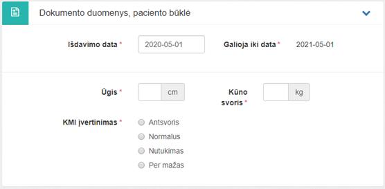 2. Dokumento duomenys, paciento būklė. Bloke užpildomi pagrindiniai dokumento ir paciento būklės duomenys. Visi bloko laukai privalomi.