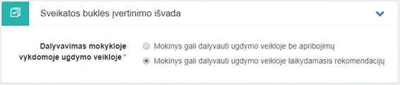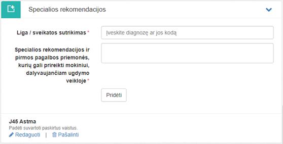 Pasirinkus antrąją reikšmę: Vaikas gali dalyvauti mokykloje vykdomoje ugdymo veikloje, laikydamasis šių rekomendacijų, būtina užpildyti bendras rekomendacijas ir pasirinktinai (neprivaloma) galima nurodyti specialias rekomendacijas.