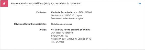 1. Asmens sveikatos priežiūros įstaiga, specialistas ir pacientas. Bloke matoma informacija apie atvykimą registravusią sveikatos priežiūros įstaigą, prisijungusį specialistą bei pacientą. Šie duomenys užpildomi automatiškai pagal prisijungusį naudotoją ir pasirinktą pacientą ir yra neredaguojami.