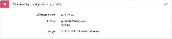 2. Dokumentą užsakęs asmuo, įstaiga. Bloke matoma informacija apie darbdavio atstovo dalį užpildžiusį naudotoją. Duomenys užpildomi automatiškai ir yra neredaguojami.