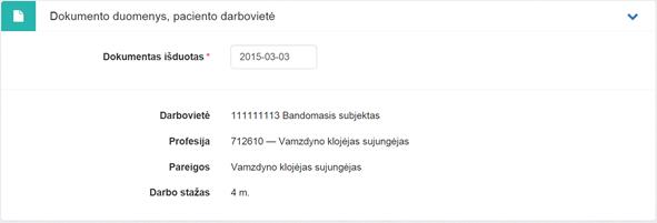 3. Dokumento duomenys, paciento darbovietė. Bloke nurodoma dokumento išdavimo data ir matomi paciento darbovietės duomenys, užpildomi automatiškai pagal darbdavio atstovo pildomą dalį ir neredaguojami.