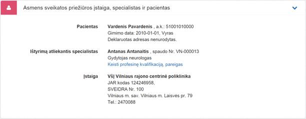 1. Asmens sveikatos priežiūros įstaiga, specialistas ir pacientas. Bloke matoma informacija apie atvykimą registravusią sveikatos priežiūros įstaigą, prisijungusį specialistą bei pacientą ir jo motiną. Šie duomenys užpildomi automatiškai pagal prisijungusį naudotoją ir pasirinktą pacientą ir yra neredaguojami.