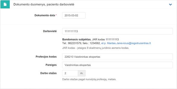 2. Dokumento duomenys, paciento darbovietė.