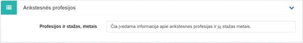 4. Ankstesnės profesijos. Bloke pildomas vienas laukas Profesijos ir stažas, metais. Leidžiama įvesti tekstinius, skaitinius ir skyrybos ženklų simbolius. Lauko pildyti neprivaloma.