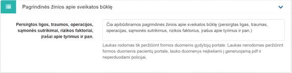 5. Pagrindinės žinios apie sveikatos būklę. Bloke pildomas vienas laukas Persirgtos ligos, traumos, operacijos, sąmonės sutrikimai, rizikos faktoriai, įrašai apie tyrimus ir pan. Jame įvedamos pagrindinės žinios apie sveikatos būklę. Leidžiama įvesti tekstinius, skaitinius ir skyrybos ženklų simbolius. Lauko pildyti neprivaloma. Laukas rodomas tik peržiūrint formos duomenis gydytojų portale.