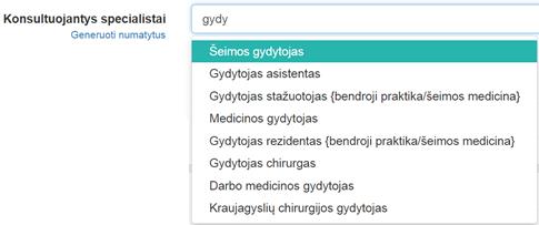 Paspaudus Generuoti numatytus, galima sugeneruoti numatytas užduotis konsultuojantiems specialistams priklausomai nuo galutinį dokumentą teikiančio (ištyrimą atliekančio) specialisto profesinės kvalifikacijos.