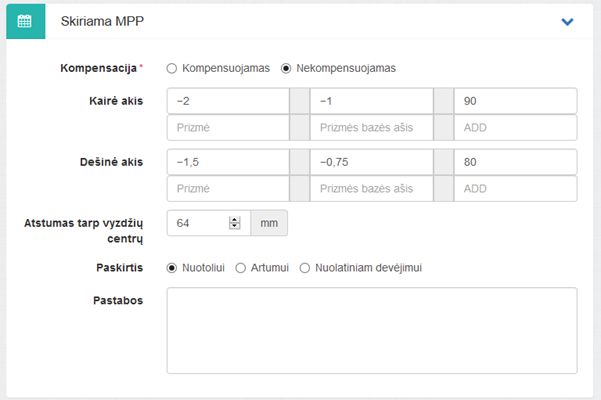 Yra galimybė pasirinkti, ar Akiniai/lęšiai yra Kompensuojami ar Nekompensuojami. Pagrindinis skirtumas, jog kompensuojamus Akinius/lęšius reikia pasirinkti iš klasifikatoriaus reikšmių.