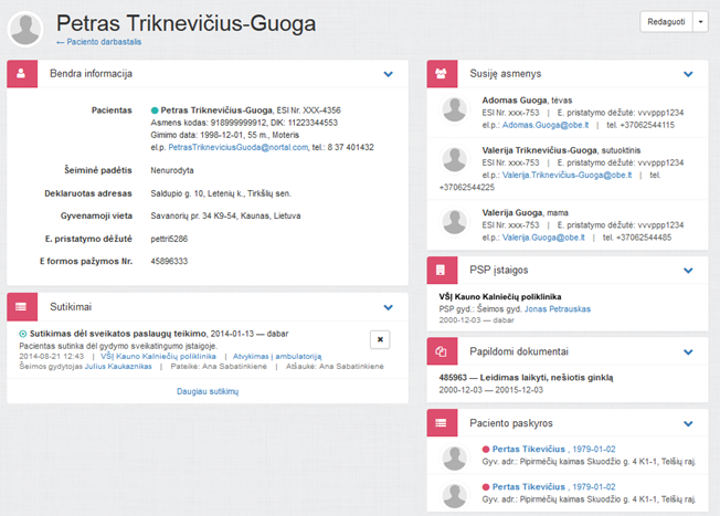 Paciento peržiūros puslapyje rodomi duomenys apie pacientą, saugomi ESPBI IS pacientų duomenų bazėje.