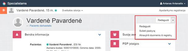 Meniu Atnaujinti duomenis iš registrų rodomas jeigu pacientui yra