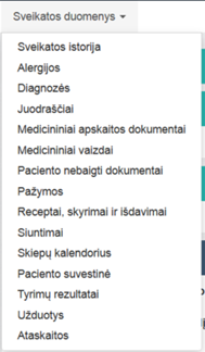 Sveikatos duomenys – išskleidžiamas meniu darbui su