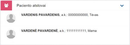 3. Paciento atstovai. Bloke matomi paciento susiję asmenys ir jų žinomi duomenys: vardas, pavardė, asmens kodas, tipas (Tėvas / Mama, Vyras / Žmona ir kt.), kontaktiniai duomenys (telefono nr., el. pašto adresai).