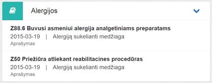 4. Alergijos. Bloke matomos alergijos iš visų paciento sveikatos istorijoje esančių pasirašytų neatšauktų E025 ir E003 dokumentų. Matoma informacija apie alergiją iš dokumento, kuriame ji buvo įvesta: alergijos pavadinimas, apytikslė jos nustatymo data, alergiją sukelianti medžiaga ir alergijos aprašymas.